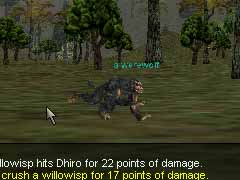 さて、Antonica大陸に渡って来ました。まずは肩慣らしに西共有地でウィスプ狩りです!って、変な猿が徘徊している事に気付いた儂は近寄ってみることに<激無謀 WereWolfでした。ファーストコンタクト。一緒に来ていたDhiroさんかMagokoroさんのどちらかが殺されました。ごめんなさい。僕のせいです(泣)。 |