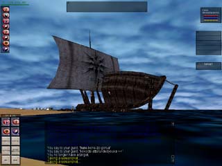 何分待っても船が来なかったので、隣でテレビゲームをやりつつ待っていたら、来た、来たですよ(>_<)/!!格好良い紋章を帆に描いた、筏の上に半分壊れた船が乗っかっている何とも奇妙な船が到着しました。如何にもEvilですね(^^)。 |