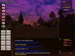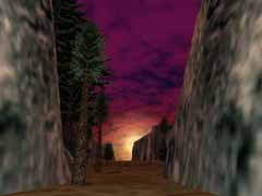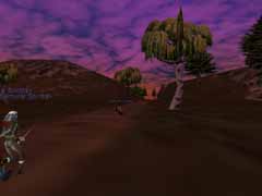この大陸横断の旅行は今までEverQuestやって来た中で一番印象的な事の一つです。HPHで大量に仲間が死んでしまって苦労しましたが(w、なんとかHPHを越え、Karana大草原の一つ、東カラナ草原へとやってまいりました。これは山道へと続く道ですね。夕日が沈んで綺麗です。 |