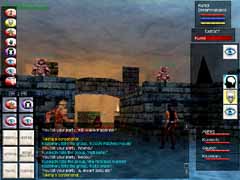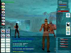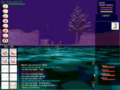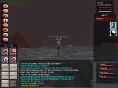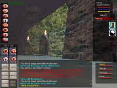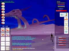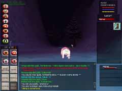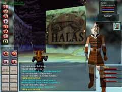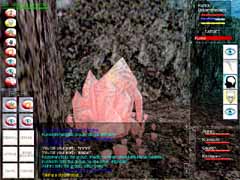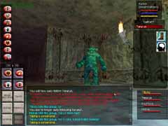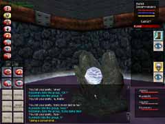 あら不思議!見事Orc達がVeliumを掘っているCrystalCavernsに到着!!スクリーンショットはVeliumです。ここからエネルギーを抽出したり、武器を作ったりする訳ですな。オーク達を倒すとこのかけらを持っていて、PCの中にはそれを求める人が沢山います。使い道は解りません(w。 入って少し逝くと、下まで落ちられる大きな縦穴があります。Levitateで浮遊し、Invisiをかけてそこを降りていきました。 |