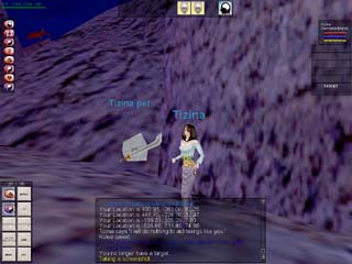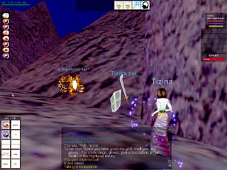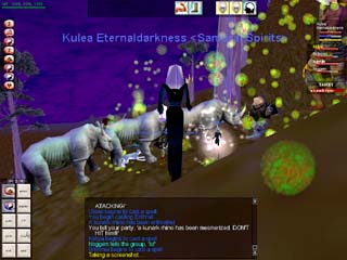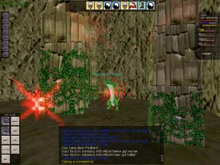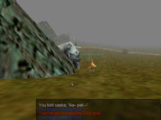 Enchanterは一人で敵を狩ることもできるよ :)。これは、ニワトリさんを私がCharmして、サイさんと戦わせているところですo(^-^)o。凄く効率が良くて、もうパーティーなんて組まなくても大丈夫! と思っていたらCharmが切れて死にました。南無南無。 |