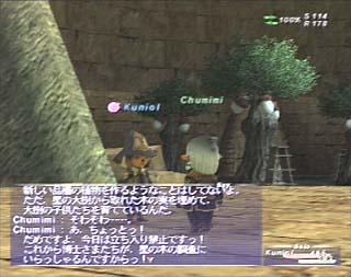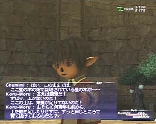 天の塔地下で星の大樹の実を育てているチュミミちゃんに話しかけると、お話が始まります。博士様達がいらっしゃるそうです! |