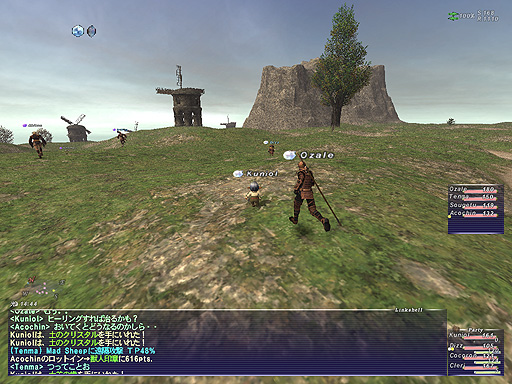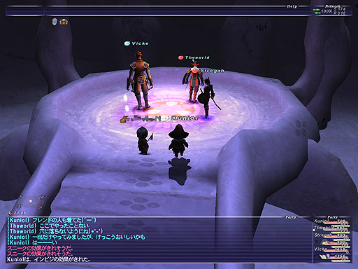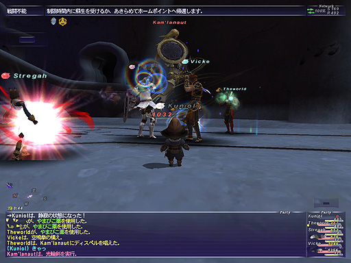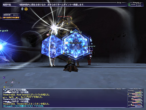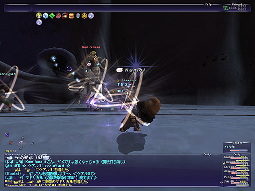 これは光輪剣のエフェクトです。リストの一番下にいるナイトさんのHPが最大から一瞬で真っ赤に(⊃Д⊂)。 けっきょく敗退して、引き上げました(汗)。この後もう一戦やりましたが、光輪剣でナイトさんがやられて再び負けました。僕のケアルが遅れたせいだ、僕のせいだ(;д;)。 カムラナート戦はこれから何回もやりましたが、最初に戦った時が一番つらかったです(;´Д`)。大風車をあれだけやられると勝ちようがないですね・・・。 |