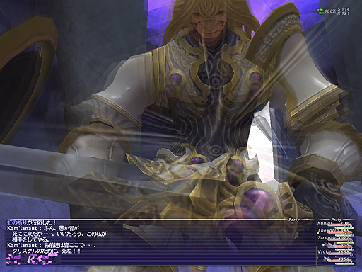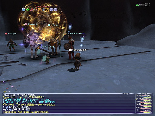 カムラナートは特殊な技でころころ属性が変わります。カムラナートの属性と同じ精霊魔法を撃つと吸収されてしまうので、細心の注意が必要です。もっとも、これだけ激戦となると精霊魔法を撃つ暇なぞないのですが(´・ω・`)。 魔法はサイレガ、2hアビまで消す範囲ディスペル、スロウガなどを撃ってきます。 |