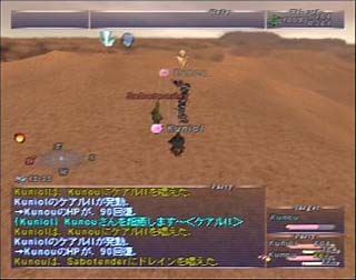 サボテンダーといえば針千本。1000ダメージなんて喰らったら大変なことになります(((;゚Д゚))) 。風の噂で、パーティーメンバーで分けて受ければその分ダメージが減るそうなので、近づいてました。けっきょく針千本は来ることなく、戦闘は簡単に終了♪ |