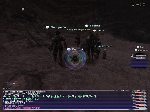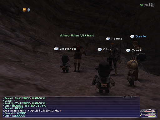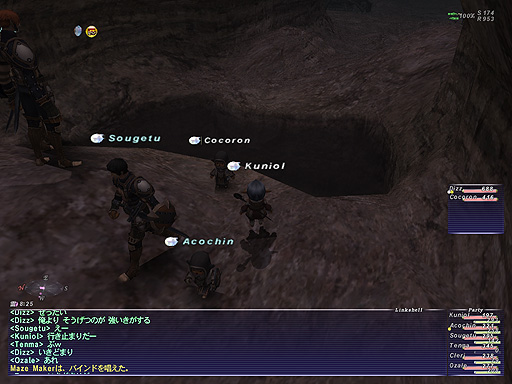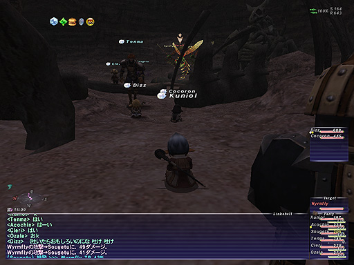 ゴブリンや骨に遭遇して戦闘をしたりしました。この時、みんな、1PTでしかできないと思い込んでいまして、あぶれたDizzさんとCocoronさんはサポート役で、レベル制限は受けていませんでした。DizzさんやCocoronさんはパーティーメンバーに回復はできず、イベントモンスターに対しては攻撃もできませぬ。 |