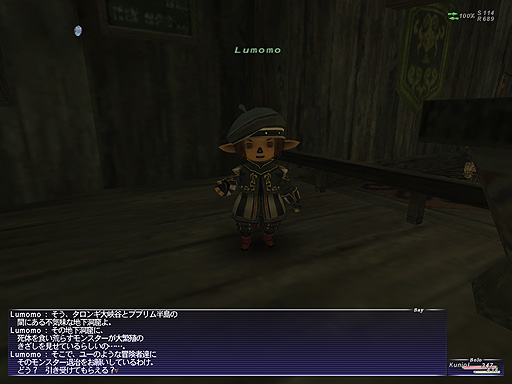DizzさんのLS、Salt of the Earthで、実装されたばかりの退魔クエストをやる事にしました。これはちょっと工夫されたクエストでして、なかなか楽しそうなのです。 退魔のクエストは3国にあり、ウィンダスはこのルモモちゃんから受けます。ちなみに、僕の中ではこのルモモちゃんが星の神子様、シャントット博士等並み居る強豪を抜いて一番好きなNPCキャラだったりします。ユーもきっと気に入るわよ。 |