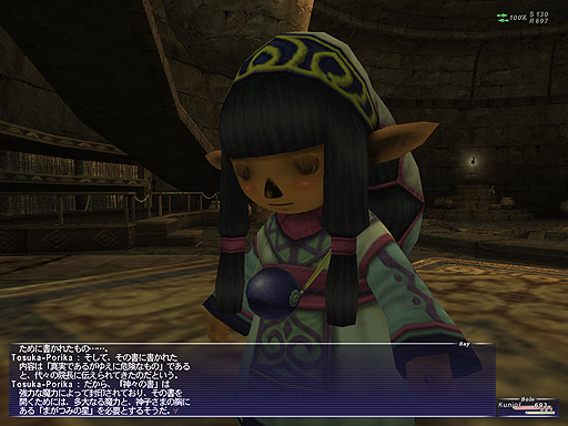 大戦中、カラハバルハは神子様を口説き、まがつみの星を手に入れ、神々の書を開き、ウィンダスの未来を知りました。その未来を変えるために、彼はトライマライの奥にある第6の院で研究を始めたのです。 トスカポリカ院長はここに神々の書が力を失い白紙になった理由があると信じて、僕にそこに行くように命令してきましたっ。 次回はトライマライに乗り込みますー。 |