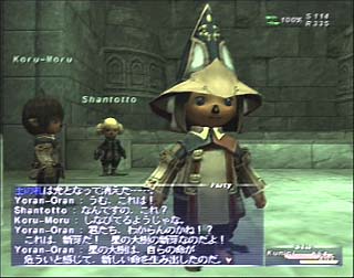 そして登場するシャントット博士。カラハバルハに貸していたのは、どうやら彼女の帽子だったようです。カラハバルハの研究室というと、ウィンダスミッションで後述する第六の院に行って来たようですね。すっかり変な臭いがついてしまったので、僕に下さるとの事!これこそ、黒魔道士にとって(少なくとも2004年6月現在)至高の頭装備であるウィザードペタソスですっっっ! シャントット様、私の体は貴方でできています〜。 |