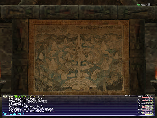 光の欠片を全て集めましたので、ゼブウェル島に行かねばなりませぬ。何処にあるかは世界中のFF廃人の皆さんが見付けてくれました。流砂洞の先にあるそうです。 という事で、Theworldさんに誘われて流砂洞に来ました。ここの壁面にはガルカが繁栄した時代の絵が描かれているので、ゆっくり見られる人は見てみましょう!・・・落ち着いて見られる環境ではありませんが(´w`)。 |