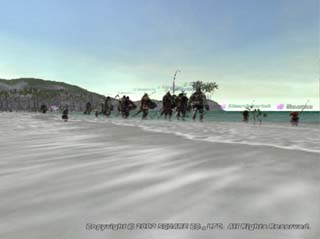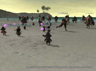 海岸に着くと、おお、もう皆さん釣りしてますね〜。 タルタルの到着を聞きつけたガルカさん達が集まってきて・・・ |