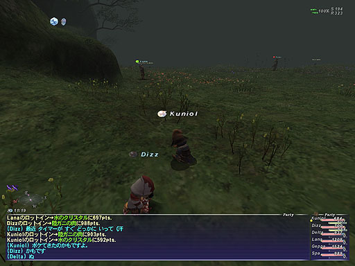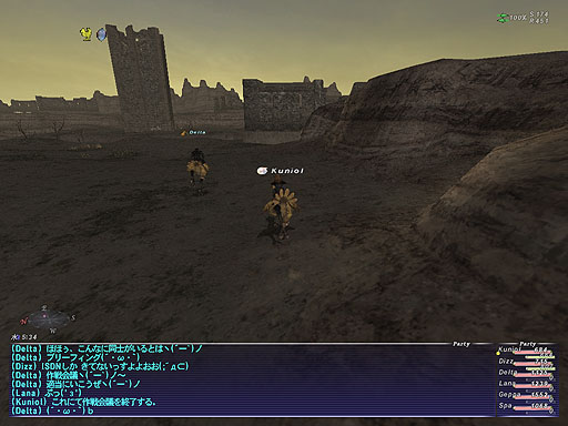 Dizzさんと組めそうだったので、Dizzさんを誘って、さらに他の人もさそってサクッとボヤーダに向けてレベル上げに出発ヽ(`Д´)ノ。後衛2前衛4ですが、盾は忍者さんです。綿密な作戦会議も終わりました。 |