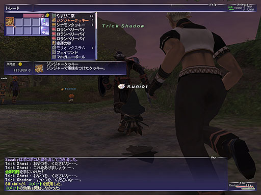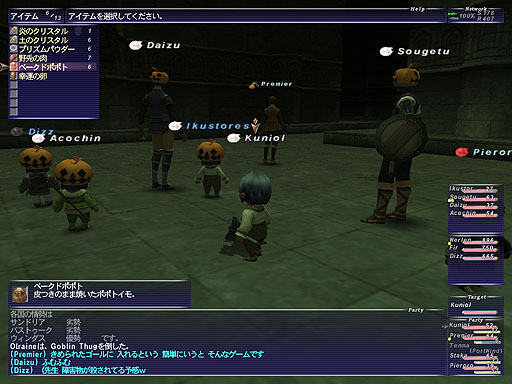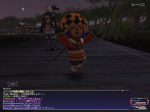 ハロウィンイベントが開催されました。この時期、英語版が発売され、街には外人さんが溢れ出しており、外人さんのためのイベント、という感じもしましたねっ。町中をお化けNPCが走り回っており、お菓子を与えるとカボチャ帽子やトリートスタッフという杖が貰えるのです。 |