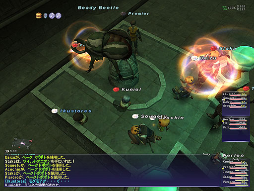 同じように招集された人々。なんと、ヴァナ・ディールサッカーの応用イベントが開催されるようなのです! このイベントのルールは、まず、紅組LSと白組LSにチーム分けします。そして、それぞれのチームにゴールが設定されており、そこまでボール(今回は強めのカブトムシ)を引っ張っていければ勝ちです。自分にターゲットを向けるために、あやつるや魔法などでHateを稼ぐのですー。しかし、ターゲットを取ったら即死級の攻撃を喰らう訳で、かなり白熱しそうです! |