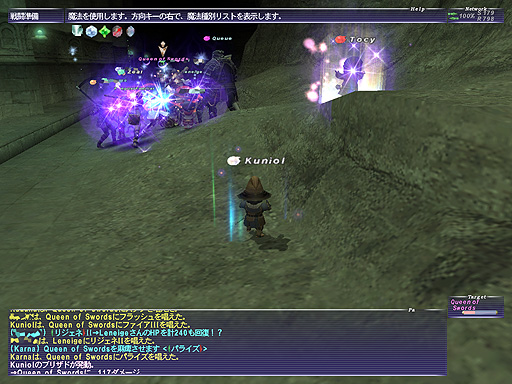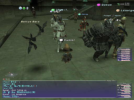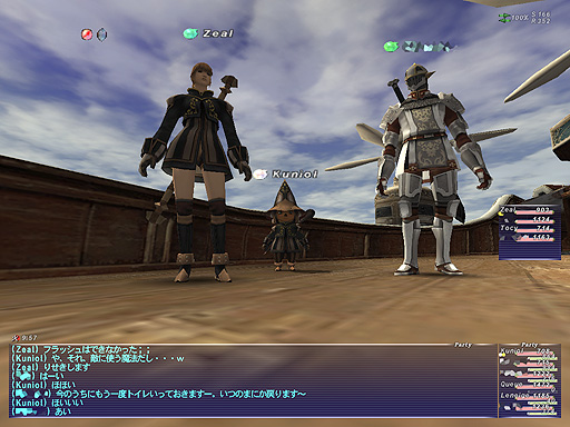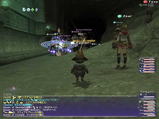 セミ・ラフィーナを追ってホルトト遺跡に行くのですが、カーディアンが待ち受けているので、多人数で行かねばなりません。LeneigeさんやQueueさんに手伝いに来て頂き、さらにTocyさんやZealさんの友達のKarnaさんも来てくれました。その他にも、シャウトで集まってくれた方々と共に、ホルトト遺跡へと向かいます。 |