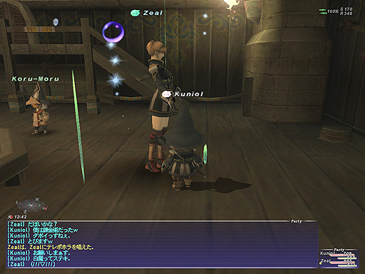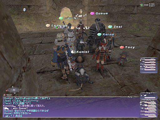 初心者ダンジョンであるはずのホルトトに、何故こんな高レベルの人達が集まるのか!?と不思議に思った外人さんが、興味深げにこちらを見ています。 外人さんと英語でやりとりし、みんなに賞賛され、いい気になるKuniol。単純な男です。 |