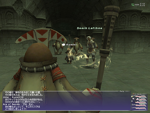 絶体絶命のピンチ!と、その時、カーディアン達の王として迎えられたジョーカーが現れます。そして、ジョーカーの命令通り、Kuniolとセミ・ラフィーナは解放され、セミ・ラフィーナから指輪も貰うことができました。ジョーカーが何故、カーディアンの王なのか、何故このような命令をしたのか、その答えもミッションを進めれば解ることでしょうっ。 |