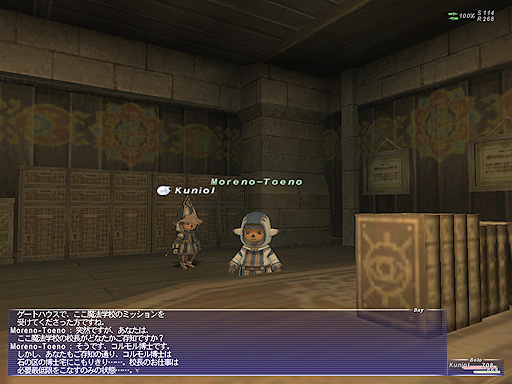 ウィンダスのミッションをまだまだ続けます!今回のミッションは、魔法学校からの依頼です。 魔法学校の先生に話し掛けると、色々話してくれます。そういえば、シャントット博士やヨランオラン博士は現役を退いているのに、何故かコルモル博士だけは現役ですな。博士という称号は、院長を退いた後に与えられるものなのですが・・・。 |