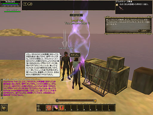 難民の島に上陸すると、自分の職業を選択することができるNPCのおじちゃんがいました。こんな一般兵士にプレイヤーの職業を決められちゃうなんて・・・! 難民船→難民島の間は、敵を倒さずともイベントごとに経験値が入ってきまして、どんどんレベルが上がります。EQプレイヤーお馴染みの「Diiiiiiiiing!!!」という効果音と共にレベルアップです。 |