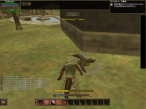 クエストを与えられたのですが、よくわからないので、とりあえず近くにある根っこを調べてみたり。アイテムを手に入れられたんですが、売却不可のアイテムだったので、捨てました(´w`)。きっと生産活動で使うですね。 |