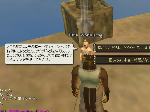 難民島には色んなNPCがいます。このノームのお兄ちゃんは、「うっかりミスの呪い」をかけられてしまった一族なんだとか。鉄が水に浮かばないのを忘れていたって、うっかりの内に入るんでしょうか・・・・・・・・。 |