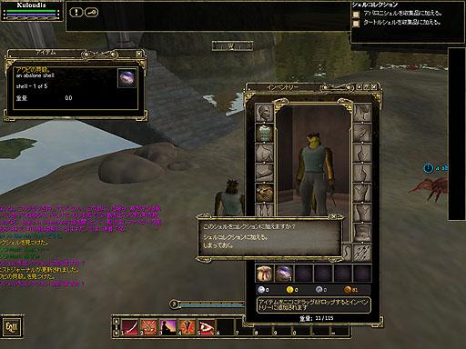 貝殻を拾い集めます。ここで訳の統一がなされていないのが解ります。クエストジャーナル上(画面右上)では「アバロニシェル」と表記されているのに、実際のアイテム名は「アワビの貝殻」となっているのです。ちょっと分かり難いですが、仕方ないですね。 |