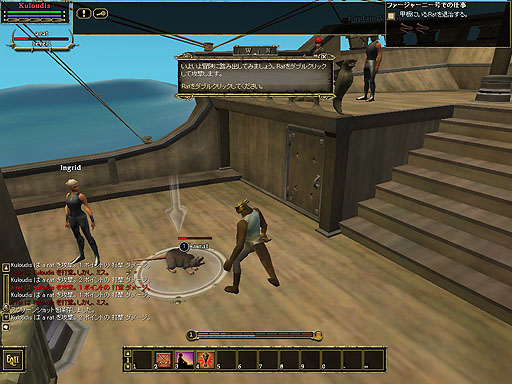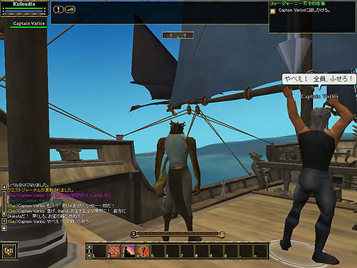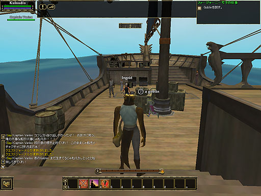 さて、EQ2では、プレイヤーキャラクターは「ノーラスを粉々に破壊した大破砕の難を逃れ、船に拾われた難民」という設定になっております。とんでもない扱いですね(笑)。 この船の上で、色々とチュートリアルをこなすことができます。 |