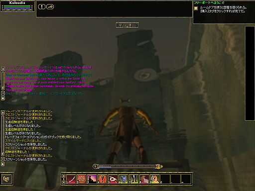 いろいろと難民島のクエストもこなし、ゴブリン共もある程度成敗しました。いよいよ、チュートリアルモードを離れ、フリーポートに乗り込みます!! このベルを使えば、フリーポートに一瞬で行けます。 |