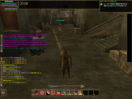 EQ2のクエストシステムは、MMORPG史上最も使い易いものになっていると思います。この金色の筋は、同じエリア内ならなんとクエストの目標NPCまで案内してくれるのですっ。 |
