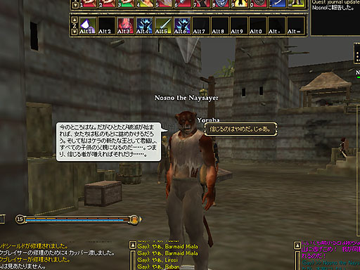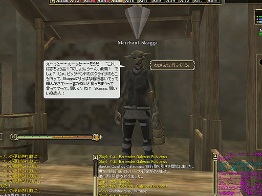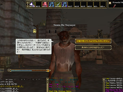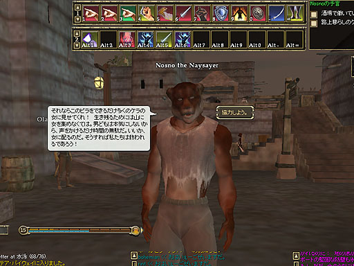 オーガとトロルの地区、ビッグベンドに来てみました。どちらの種族も頭がおかしいですが、オーガの方がまともです。トロルは究極的に脳味噌が腐ってる奴が多く、こんな奴等と住まわされているオーガが可哀想です。 スクリーンショットはガード隊長さんです。エーン、エーン、エーン。犬退治のクエストをくれます。 |