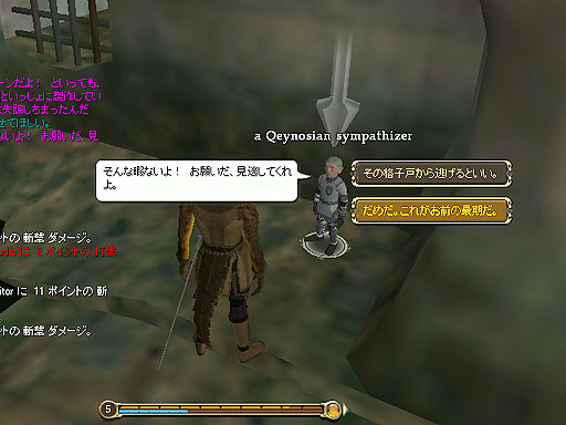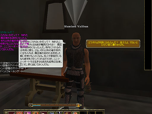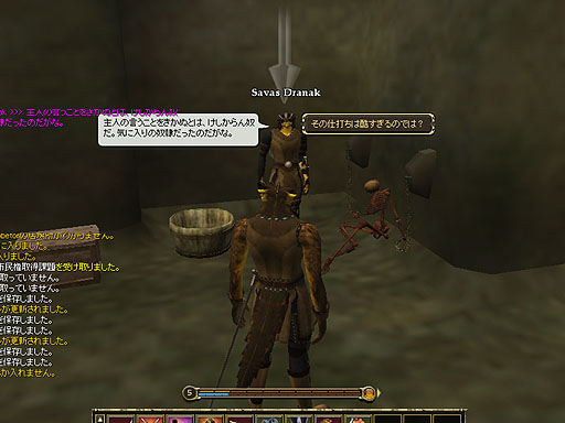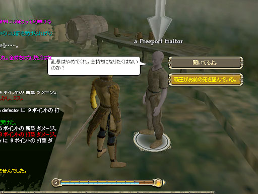 大家さんとのやりとり。フリーポートのNPCは全員、頭がおかしくなってるんじゃないか?というほどブッ飛んだ台詞を次から次へと吐きますが、それに対応するプレイヤーの台詞も凄まじいです。「でないと酷い目に遭わせるぞ」って・・・・(w。 |