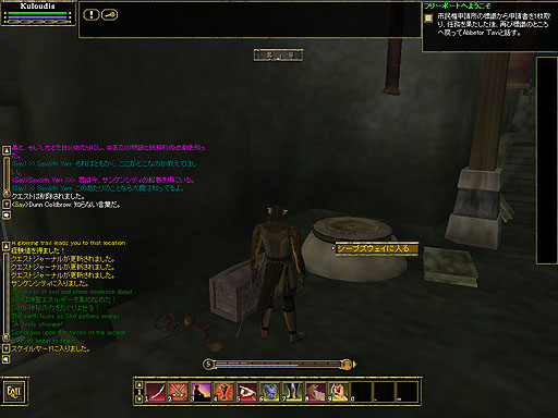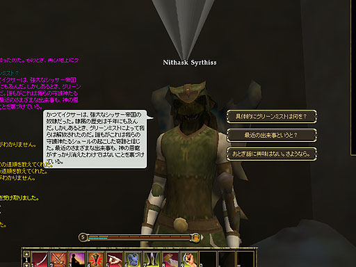 NPCの中には、EQ1の頃の伝承を色々と話してくれるものがいっぱいいます。さすがに前作があると、世界観の深みも違うですねー。この霧の話ってどういう関係があったんでしたっけ、ここら辺の話かな? |
