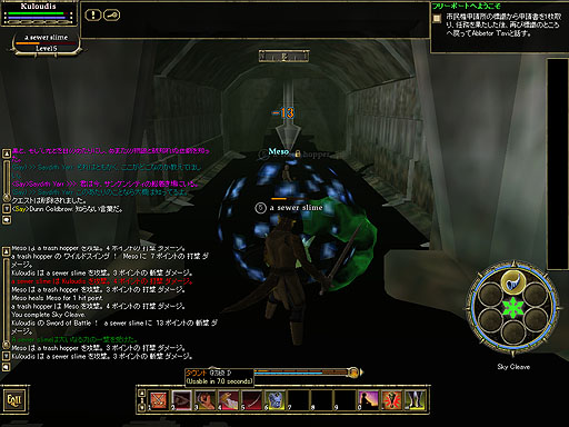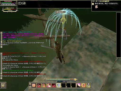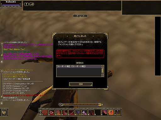 早速、フリーポート本体に行って、まずは・・・死んでみました lol。いや、一回も死んだことがなかったので、死んだらどうなるのかなーと思い、高いところから飛び降りてみたのです。案の定、大ダメージを喰らって即死!すると、こんなメッセージウィンドウが現れ、一番近くの安全地点に戻ることができます。また、この状態で待機し、復活呪文を受けることもできます。 |