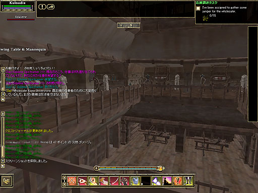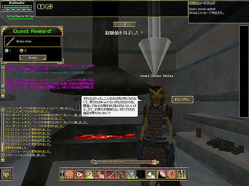 ここは所々にあるNPCの鍛冶屋さんです。EQ2はデスペナルティとして武器の摩耗が存在しており、死んだらちゃんと直さないといけません。 この鍛冶屋のお姉ちゃんは声優さんの声付きです。色っぽい声で喋りながら、イクサーらしく「シャアァァー」と言ってます。なかなかイクサーっぽい雰囲気が出ていてナイスです :)。 |