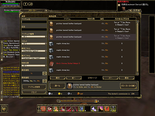 EQ2の競売所とも言えるマーケット(ブローカー)を発見です。マーケットはようやくちょっと理解できてきました。FF XIの競売所に比べると僅かに不便ですが、まああんまり物流が便利すぎるのもプレイヤー間の交流を減らす一因となってしまうので、これくらいが良いかなーという印象です。 様々なところで、EQ2はEQ1をベースとしながら既存のMMORPGからアイディアを拝借し、それを極めて次元の高いレベルで融合させているゲームだと感じます。 |