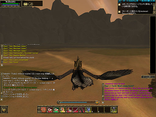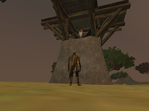 さて、コモンランドをうろうろしていると、小さな塔のような建物を発見。近付いてみると・・・なんとグリフィンがいるではないですかヽ(゜Д゚)ノ!助けてくれぇ!! ということはなく、EQ1ではコモンランドで初心者を虐殺して回っていたグリフィンも、EQ2では便利な交通手段として存在しております。早速乗ってみます。 |