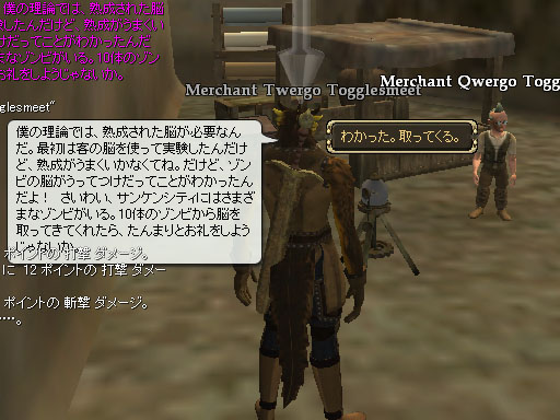 フリーポートは、フリーポート東区、西区、北区、南区の中心街の他に、それぞれの種族が暮らす街が沢山くっついています。プレイヤーはそこからスタートするというわけですね。 ここはノームとラトンガの住処、テンプルストリート。その一角で、ノームとラトンガの商人一家が睨み合いをしています! |