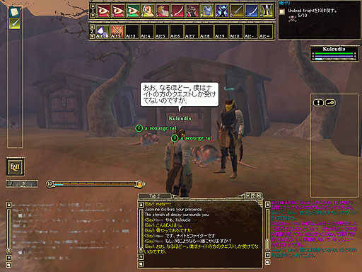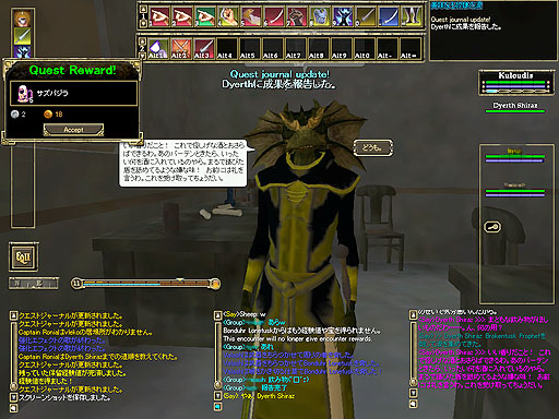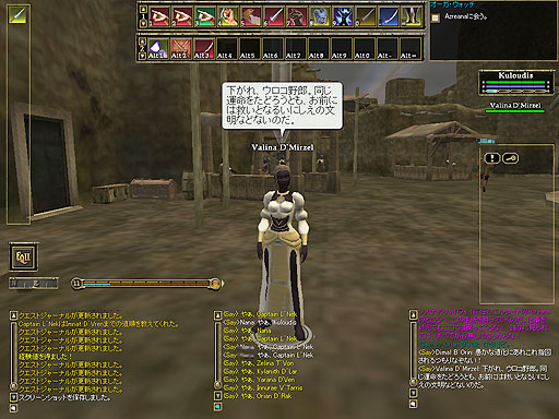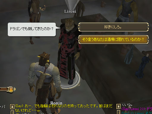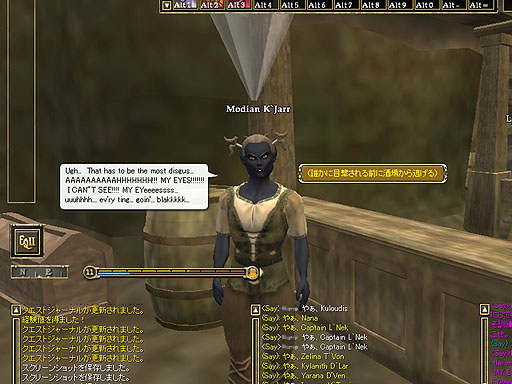翌日、ログインしてみると、同じ街にBohemianさんがいましたので、ちょっとお話タイム☆ なんていうツッコミどころ満載な髪型をしているんでしょう・・・。 どうやら直ぐそこに、まだ装備していない首装備をくれるNPCがいるとのことで、話し掛けてみました。 |
