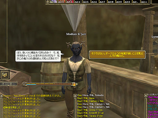 スケールヤードの酒場に報告しに行きます。 この酒場、バーバリアンの店なのですが、どうも酒の味の評判がよろしくない様子。それを気にかけた主人が、酒にうるさいダークエルフに味をみてもらおうということで、プレイヤーがダークエルフまで酒を渡しに行くクエストもあります。 |