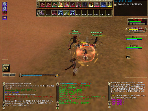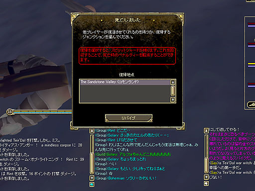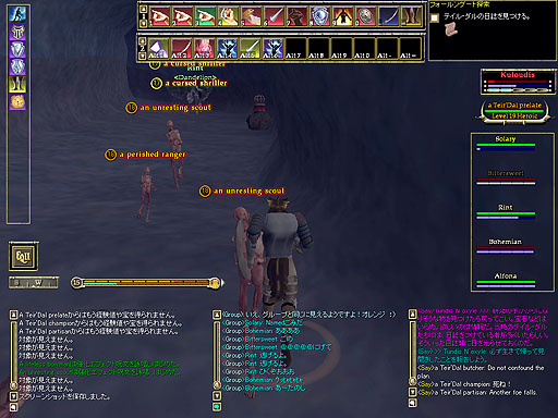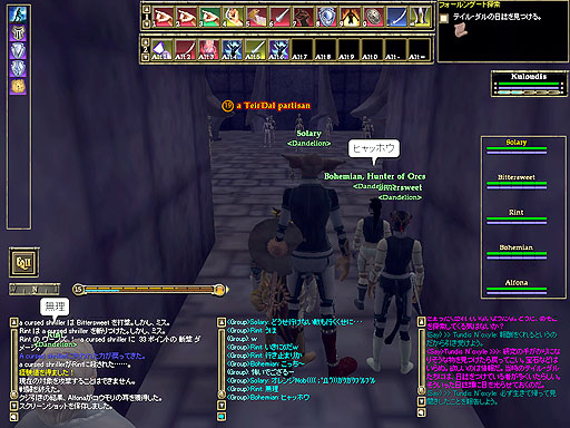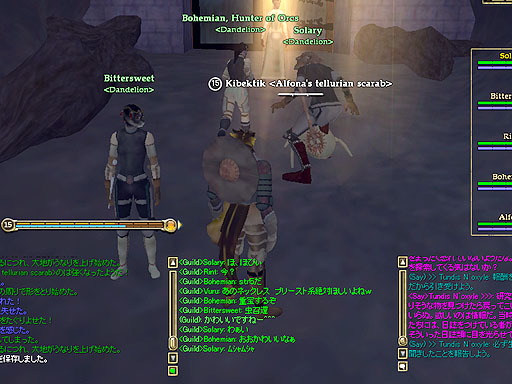 みんながインスタンスゾーンから出て行った直後に、敵がrepopし始めたのです(;´Д`)。取り残され襲われる僕とSolaryさん。しかし、息のあった連係プレーで見事撃破する事ができました。より絆が深まった気がします(`Д´)O。 |
