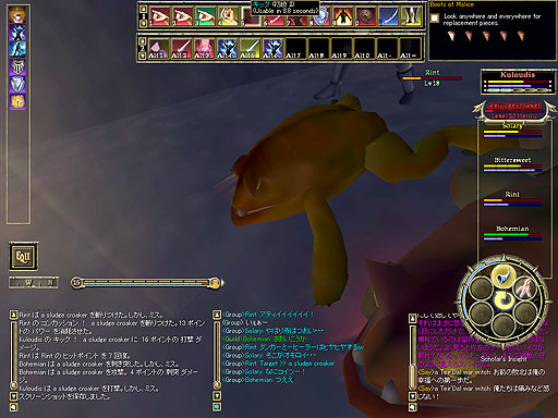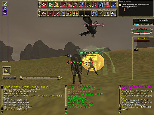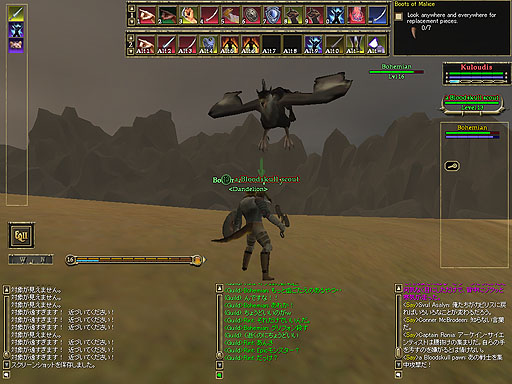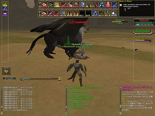 Bohemianさんと一緒に遊ぼう!です。コモンランドに集合し、ウロウロしていると、グリフォンを発見しました。25レベルの相当手強い奴です。二人でも倒せないでしょう。まあ、足下にいるオークが僕達にとっては相応しい相手なんじゃないでしょうか。 |